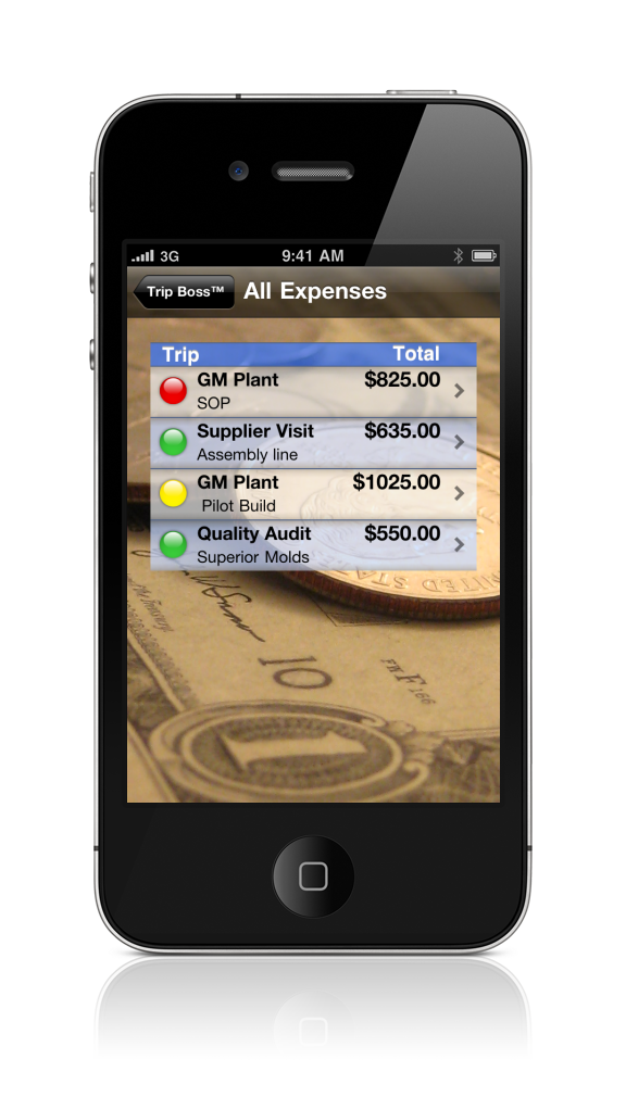 Quickly glance at All Trip Expenses' Reimbursement status with convenient summary screen and status graphic. Just tap the colored orb graphic to change the status.